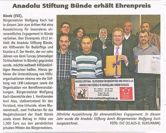 Bünder Zeitung: Bürgermeister Wolfgang Koch vergibt Ehrenpreis an die Anadolu Stiftung Bünde
